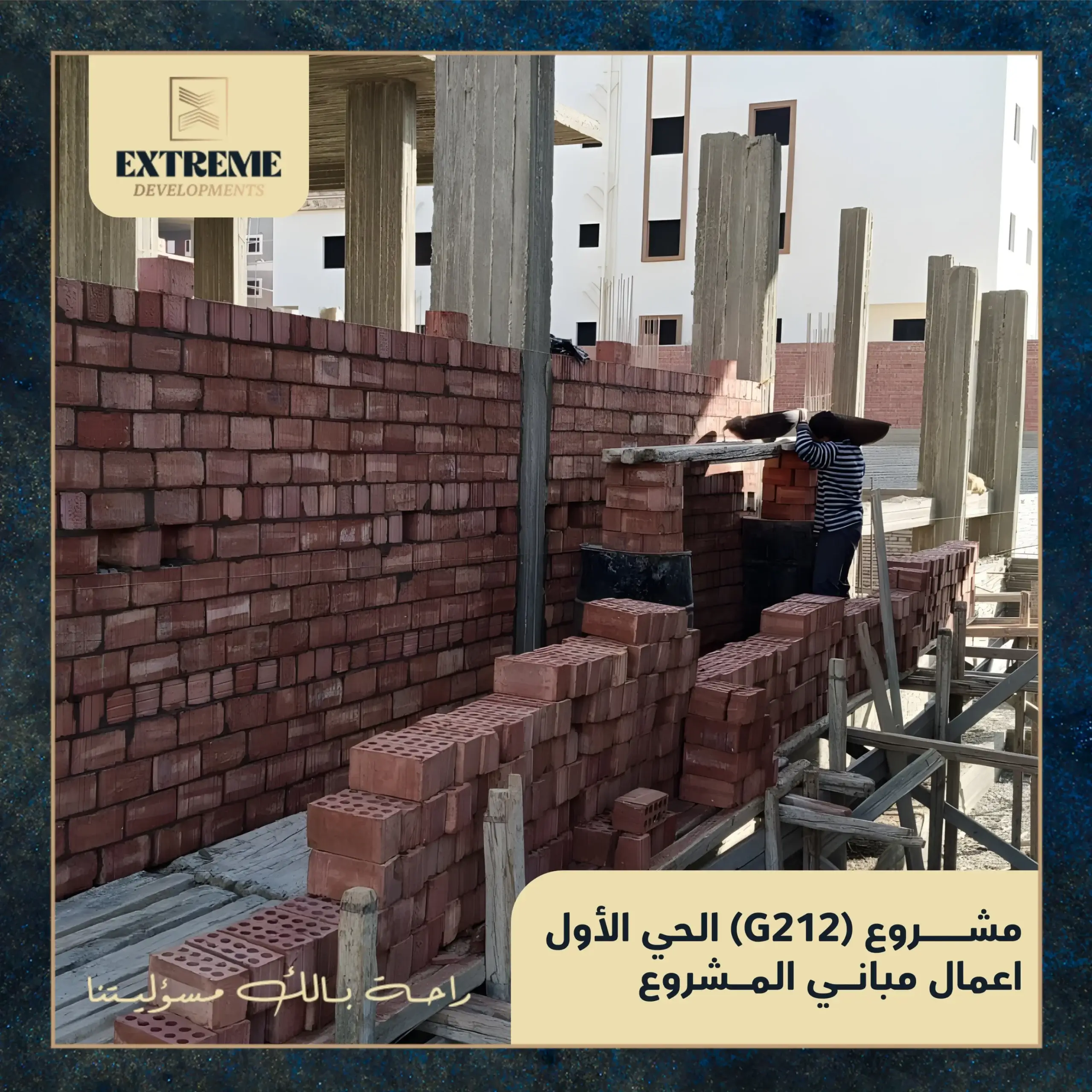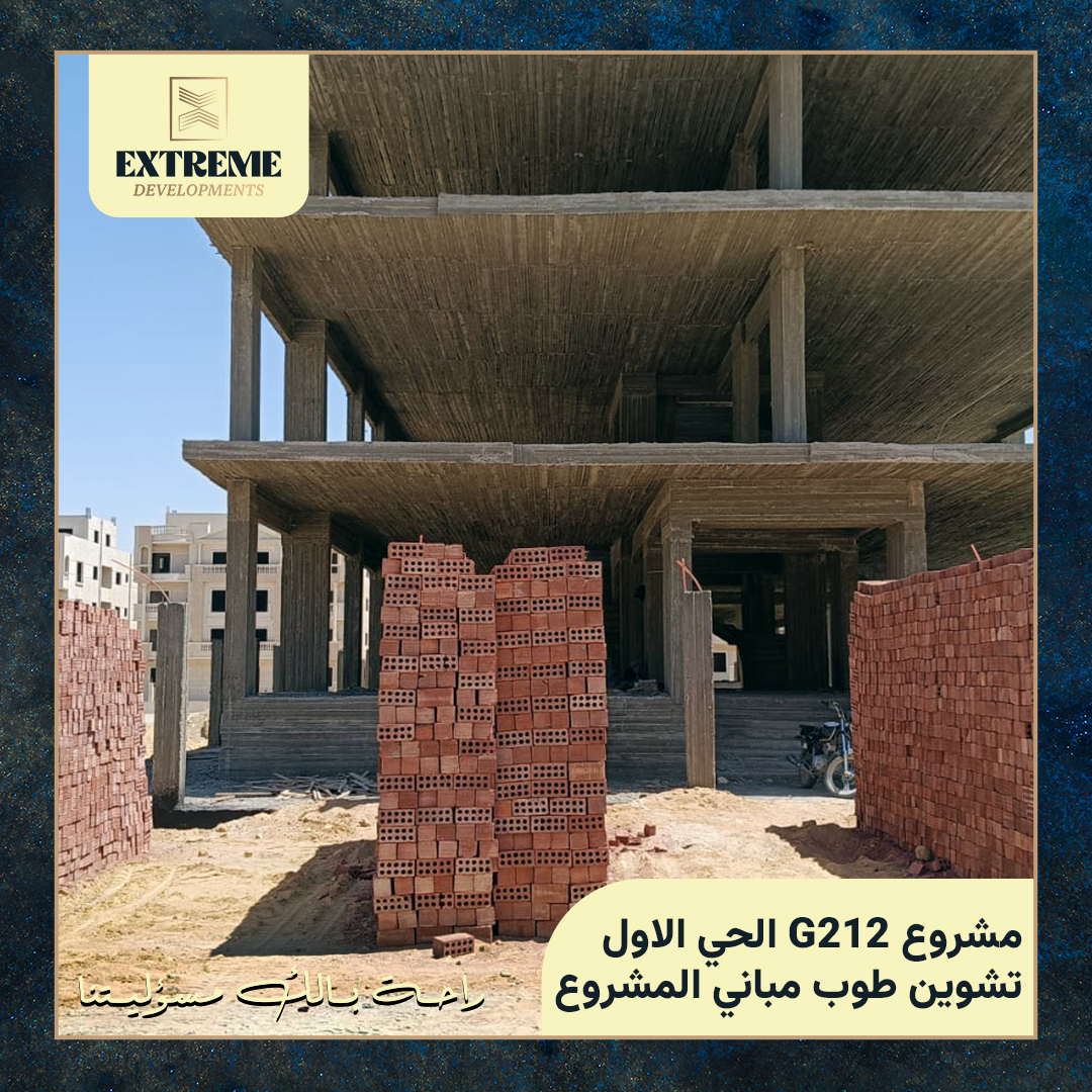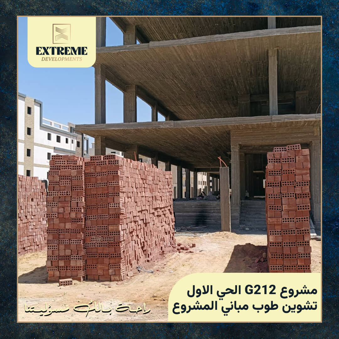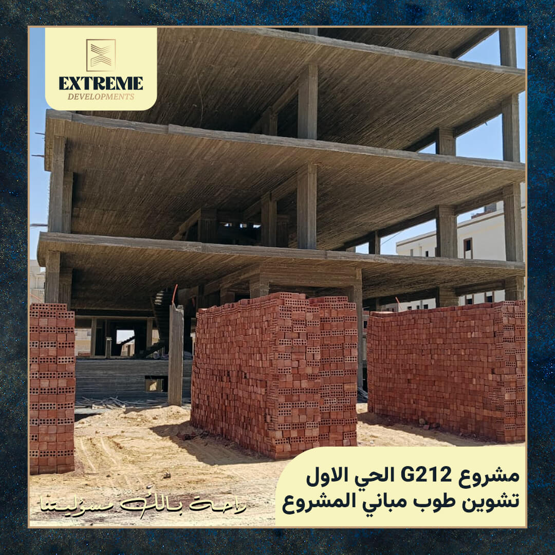 مع الانتهاء من الأعمال الخرسانية بالكامل، تنتقل الأعمال إلى مرحلة المباني بالطوب وفق المخططات التنفيذية المعتمدة، وبمتابعة دورية من الإدارة الهندسية وفِرق الإشراف الفني بالموقع.