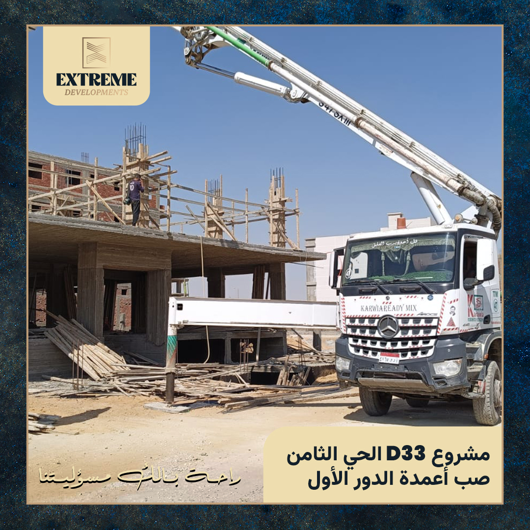تم أستلام أعمال النجارة بواسطة الادراة الهندسية التابعة لشركتنا وذلك قبل الدخول في مرحلة الحديد وكذلك تم أستلام أعمال الحدادة وفق التصميم الهندسي والتاكيد علي توزيع الكانات بالمقاسات المضبوطة والتاكيد علي الرباط واستلامها ووضع البسكوت في الجوانب للحفاظ علي الغطاء الخرساني للاعمدة قبل تقفيل النجارة وبدأ عملية الصب والتي أستخدم فيها الخرسانة الجاهزة بالجهد المحدد وفق التصميم الانشائي المعتمد المجمعة العشرية بجهاز مدينة القاهرة الجديدة.